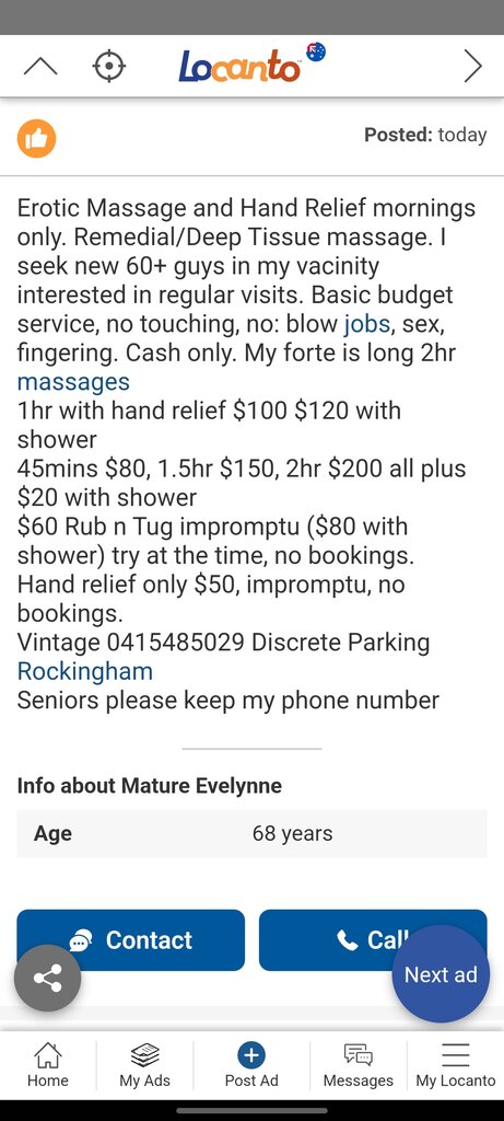 I unknowingly booked her for a 90 minute massage one day, she advertises under another name as well and didn't know it was her until i got there. Went through with a legitimate massage, wasn't much else availabe at the time as she shouldn't of been working because of lock downs. Massage was decent, didn't ask for any extras because the thought of having a granny handling my cock didn't appeal to me. Fixed my sore mucles though.Definitely. But i have to wonder how good the two hr massage would be . She says that's her forte![]()