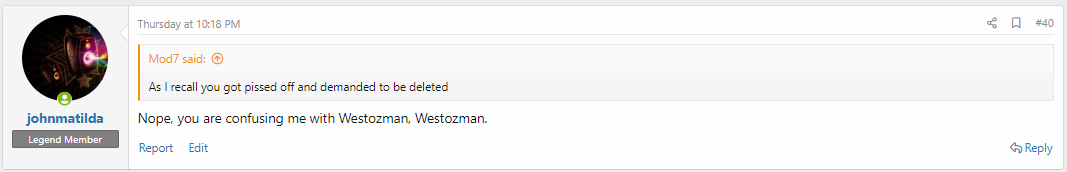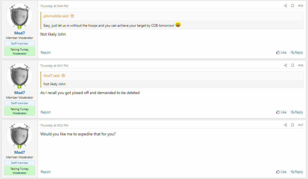 John I am not allowed to use our history in my role as Mod. Yes we have disagreed on a number of issues before where we both got upset , but tell me and everyone else here seriously what your issue is with me as a mod Arent we alll entitled to an opinion? There are 3 mods plus a veto to make a decision on a contentious post.